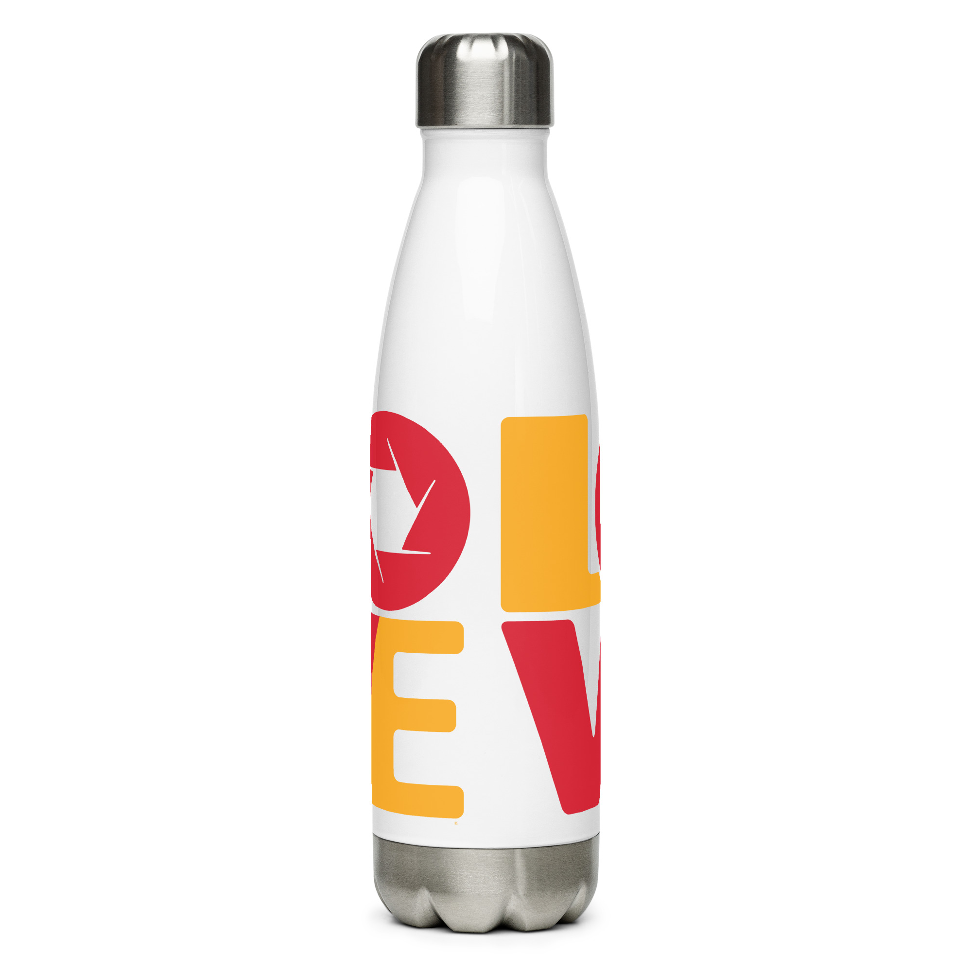 Designed as a tribute to Robert Indiana’s timeless LOVE graphic, this version swaps the classic “O” for a six-blade aperture, turning a universal message into a clear expression of devotion. The bright red and golden tones wrap around a glossy, high-grade stainless steel body designed for carrying, refilling, and reuse.