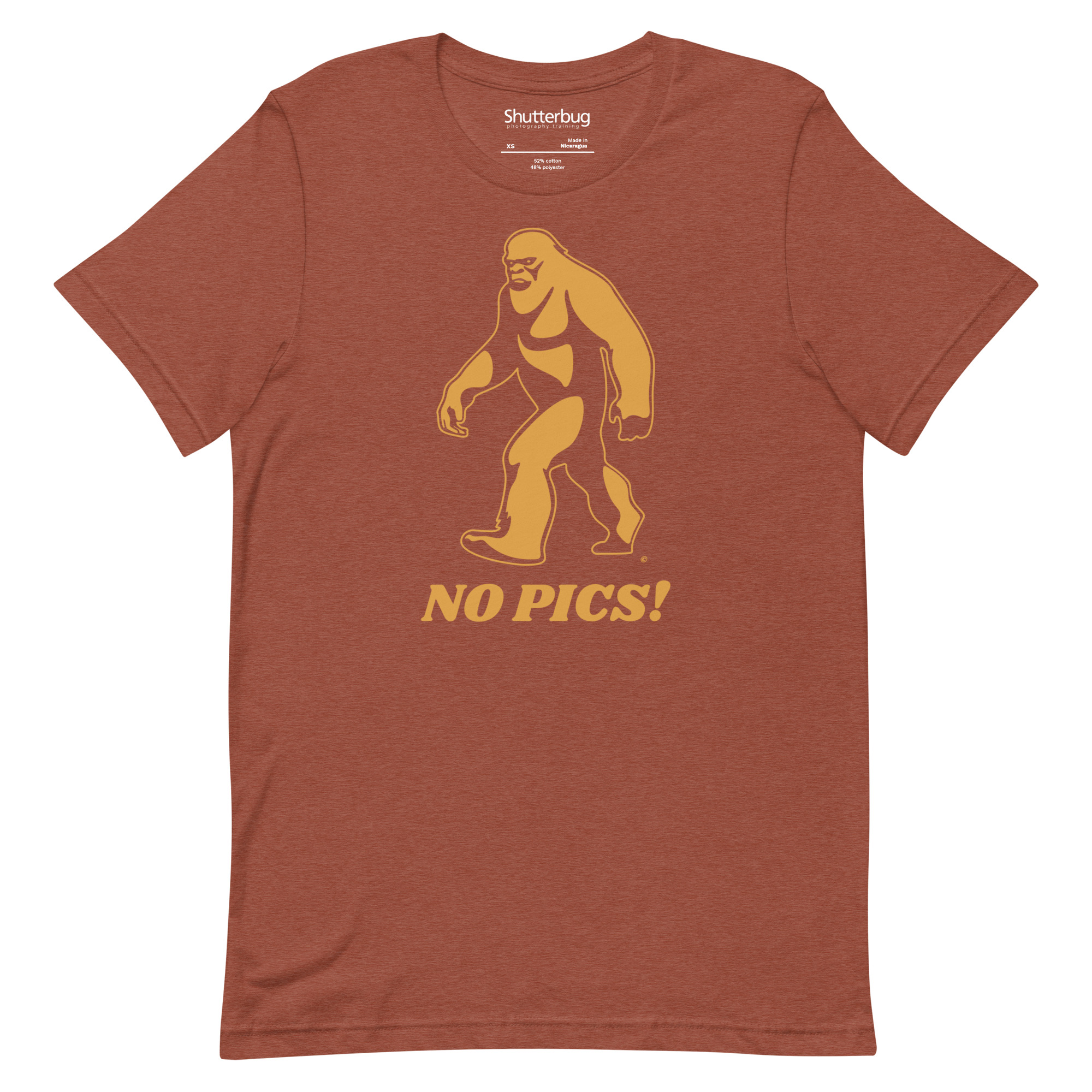 We don’t think that’s an accident. Bigfoot knows when your autofocus is struggling. He can hear the whir of your zoom lens from half a mile away. He’s not a myth. He’s just not interested in giving you usable footage. This design captures his exact sentiment in bold orange and black: NO PICS!